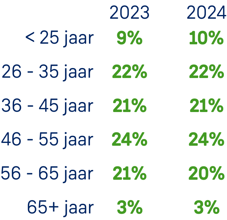 De leeftijdsverdeling binnen Brocacef Groep is ongeveer gelijk gebleven. Er is een lichte toename in de categorie 25 jaar en jonger en een lichte daling in de categorie 56-65 jaar ten opzichte van 2023.